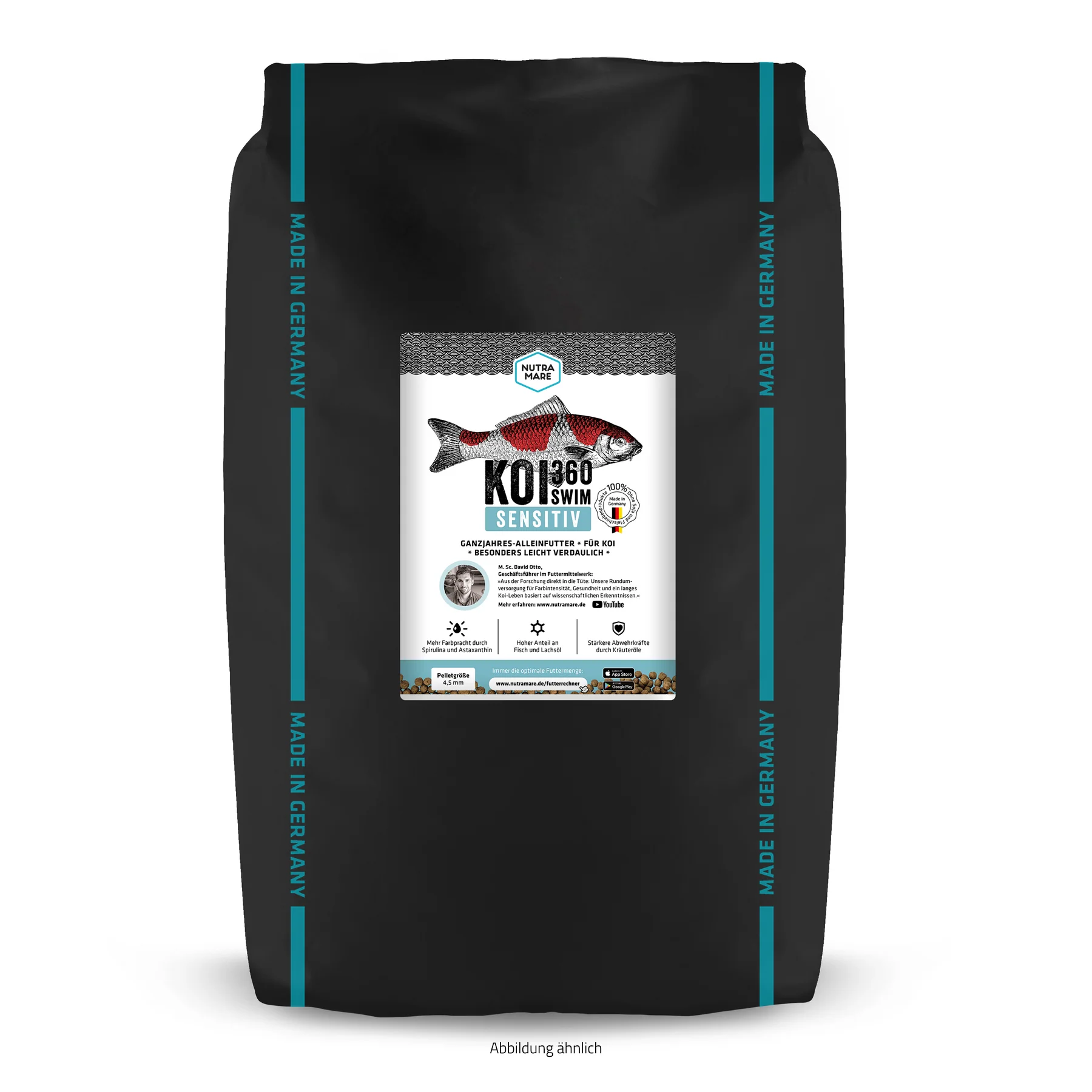 Das Nutramare Koi360 Sensitiv Swim ist optimal für alle kritischen Situationen entwickelt. Es ist maximal hochwertig und weist einen minimierten Protein-, Phosphat- und Energiegehalt auf. Es enthält außerdem farbunterstützende Zutaten wie Spirulina und Shrimpsmehl. Zudem enthält es viele Gesundheitsförderer und Vitamine. Somit unterstützt es den Koi in jeder Lage und entlastet geschwächte Tiere durch geringeren Verdauungsstress. Enzym+ verbessert zudem die Phosphorresorption und stärkt die Grätenstrukturen (präventiv gegen Verkrümmungen).